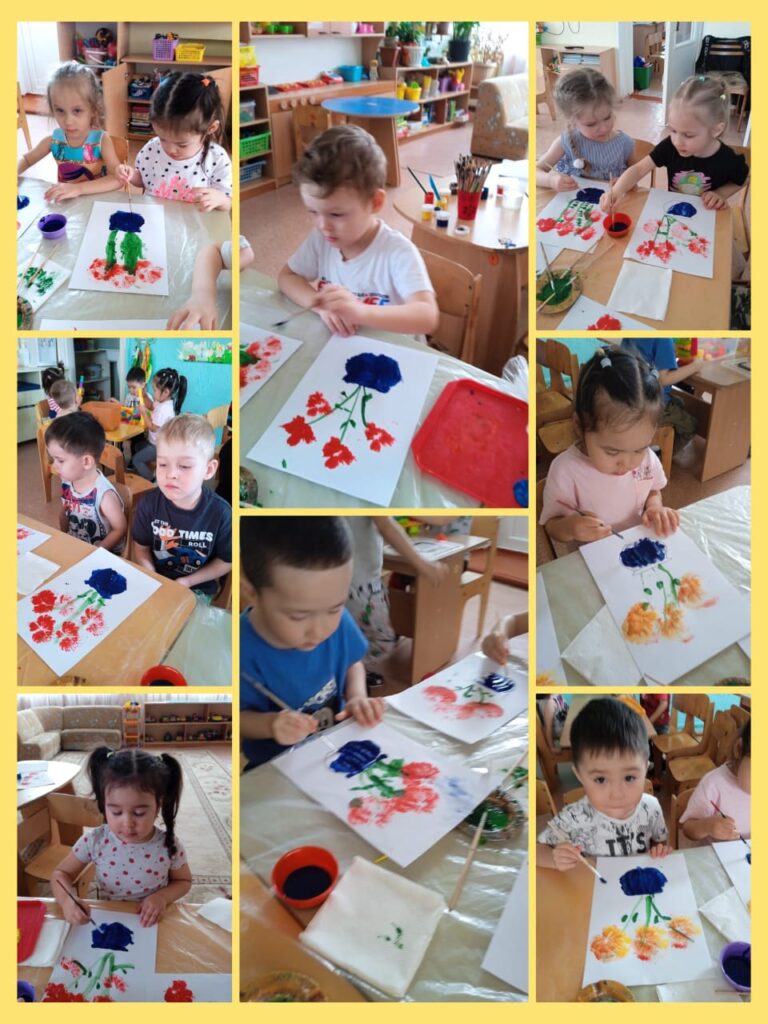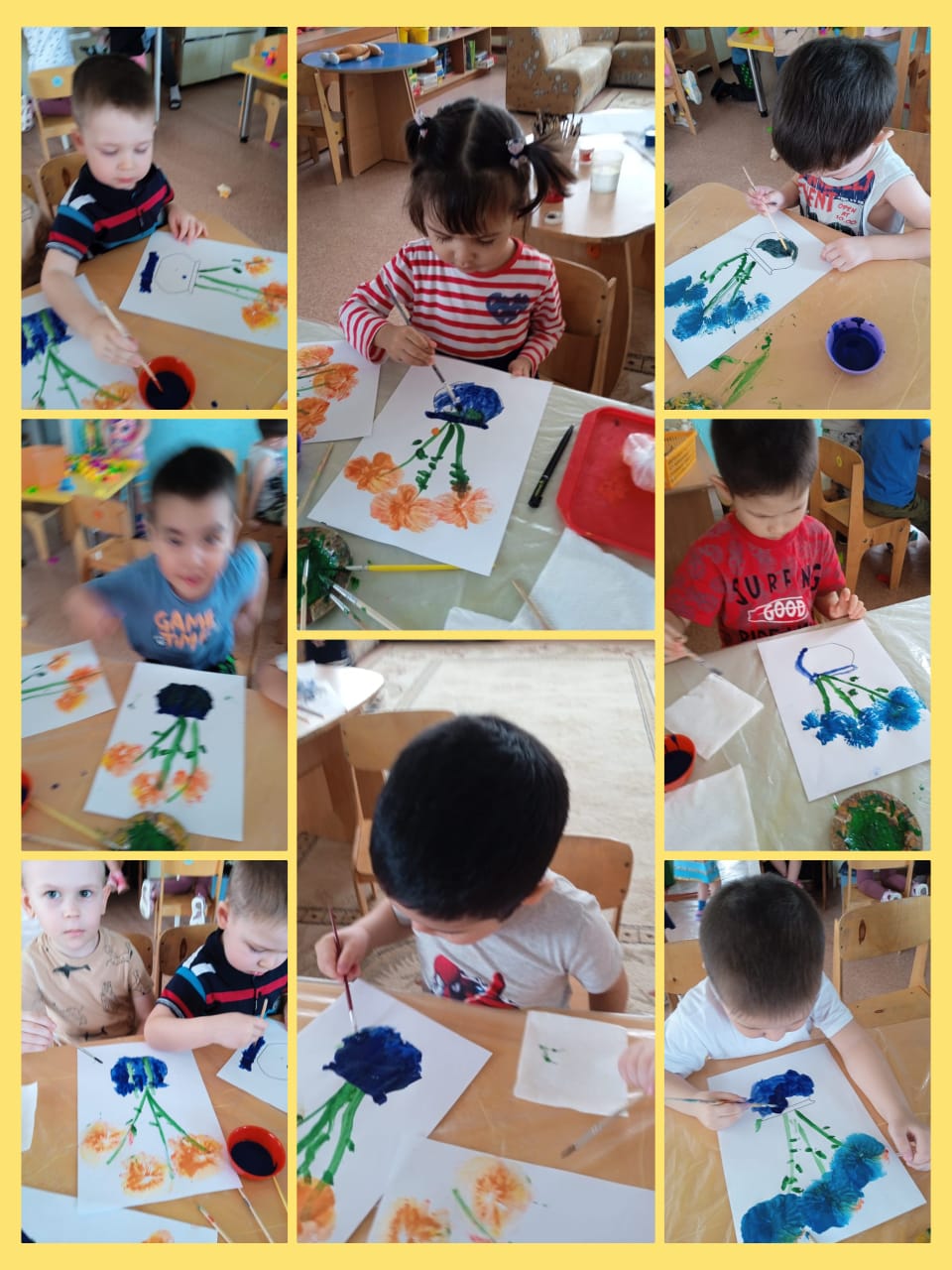 Біздің “Күншуақ” тобымызда балалар дәстүрлі емес техниканың әртүрлі түрлерін қолдана отырып, үлкен қызығушылықпен сурет салады. Дәстүрлі емес сурет салу қол-көз координациясының даму деңгейін арттыруға көмектеседі. Балалар құмырадағы гүлдерді целлофан пакетімен басып шығарумен бояды. Бұл сурет техникасы қуанышты көңіл-күйді тудырады, бояудан қорқуды, сурет салу процесінде жеңе алмау қорқынышын жеңілдетеді.