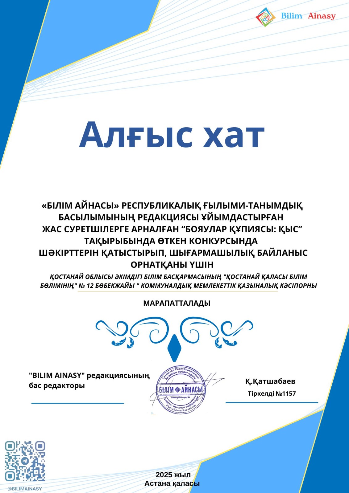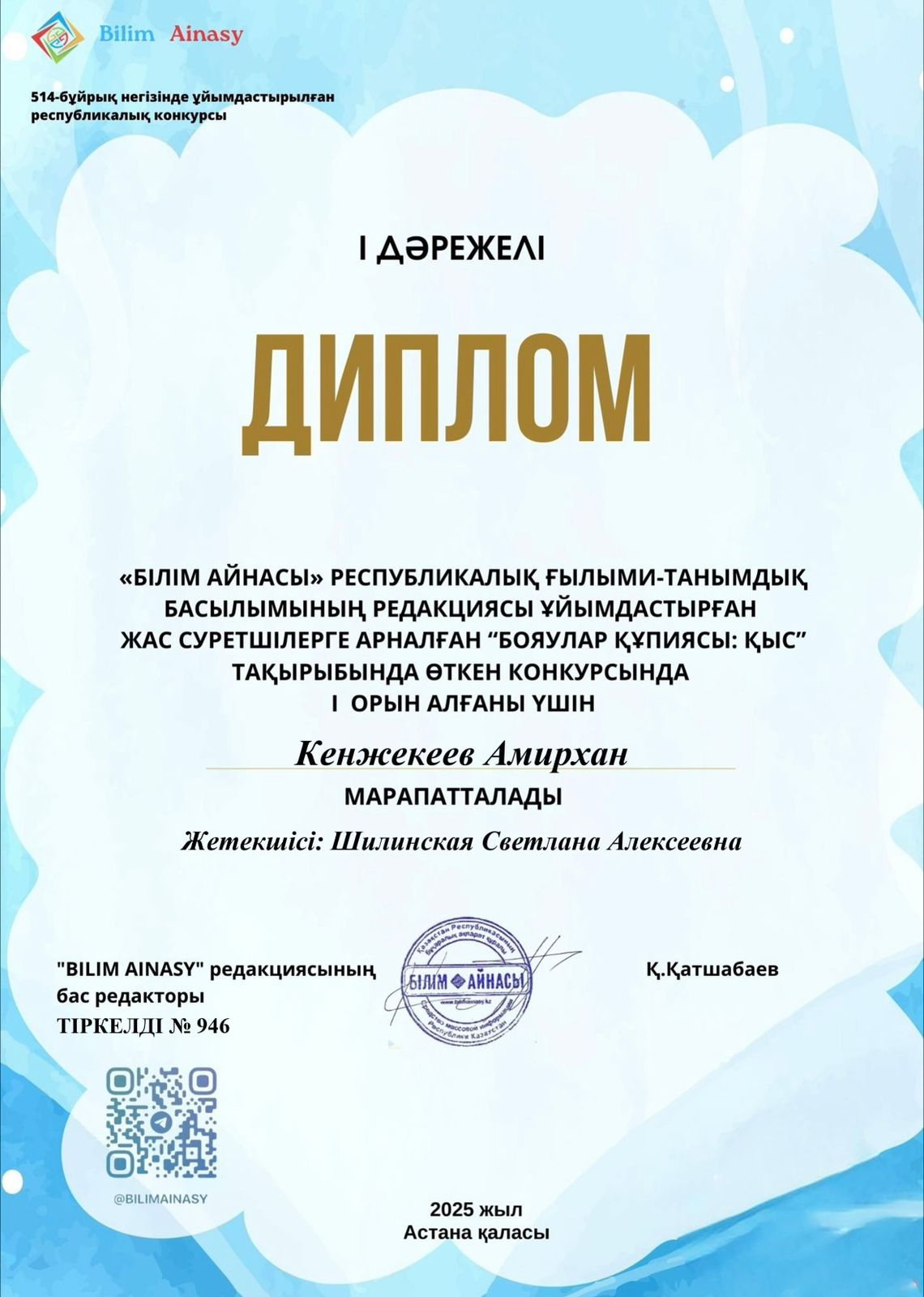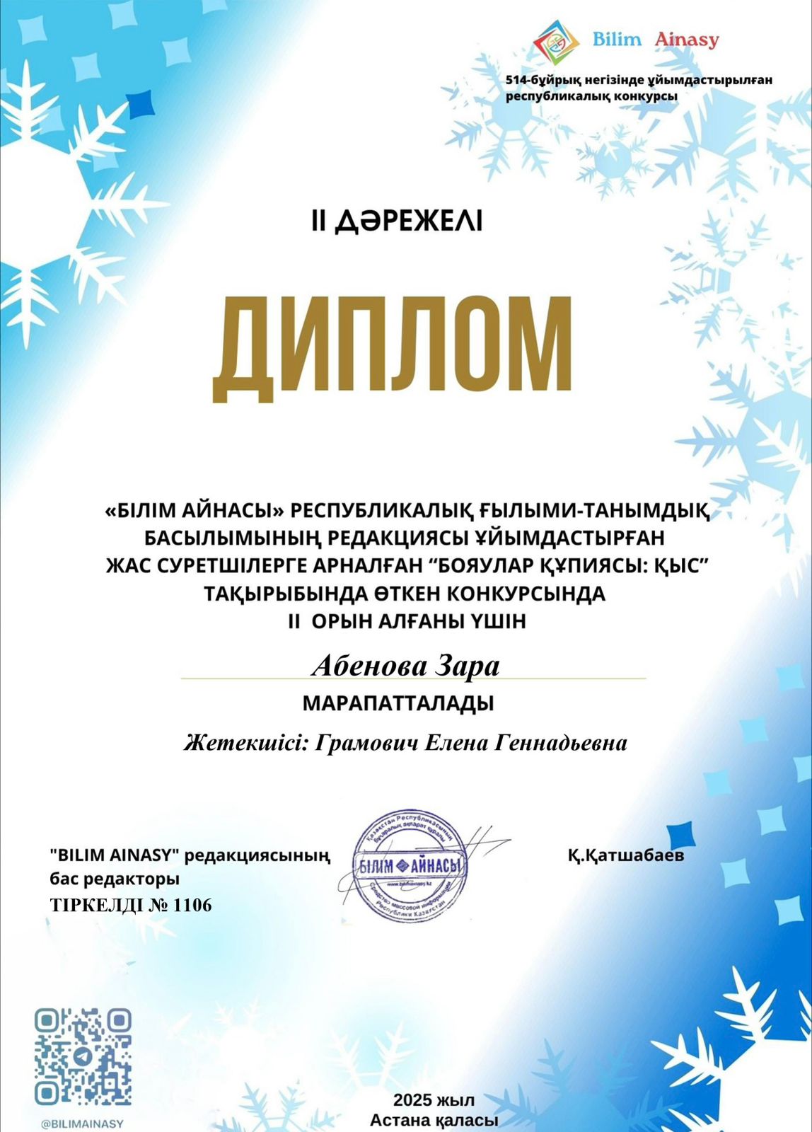 12 балабақша тәрбиеленушілері "Қыс" тақырыбындағы суреттер байқауына белсенді қатысып, жүлделі орындарға ие болды. Әр қатысушы өз жетістіктері үшін диплом алды, ал балабақша тәрбиеленушілеріміздің қатысуы мен жетістіктері үшін бір жалпы грамотамен марапатталды. Балаларға күш — жігері үшін, ал мұғалімдер мен ата-аналарға-қолдау мен шабыт үшін алғыс айтамыз!