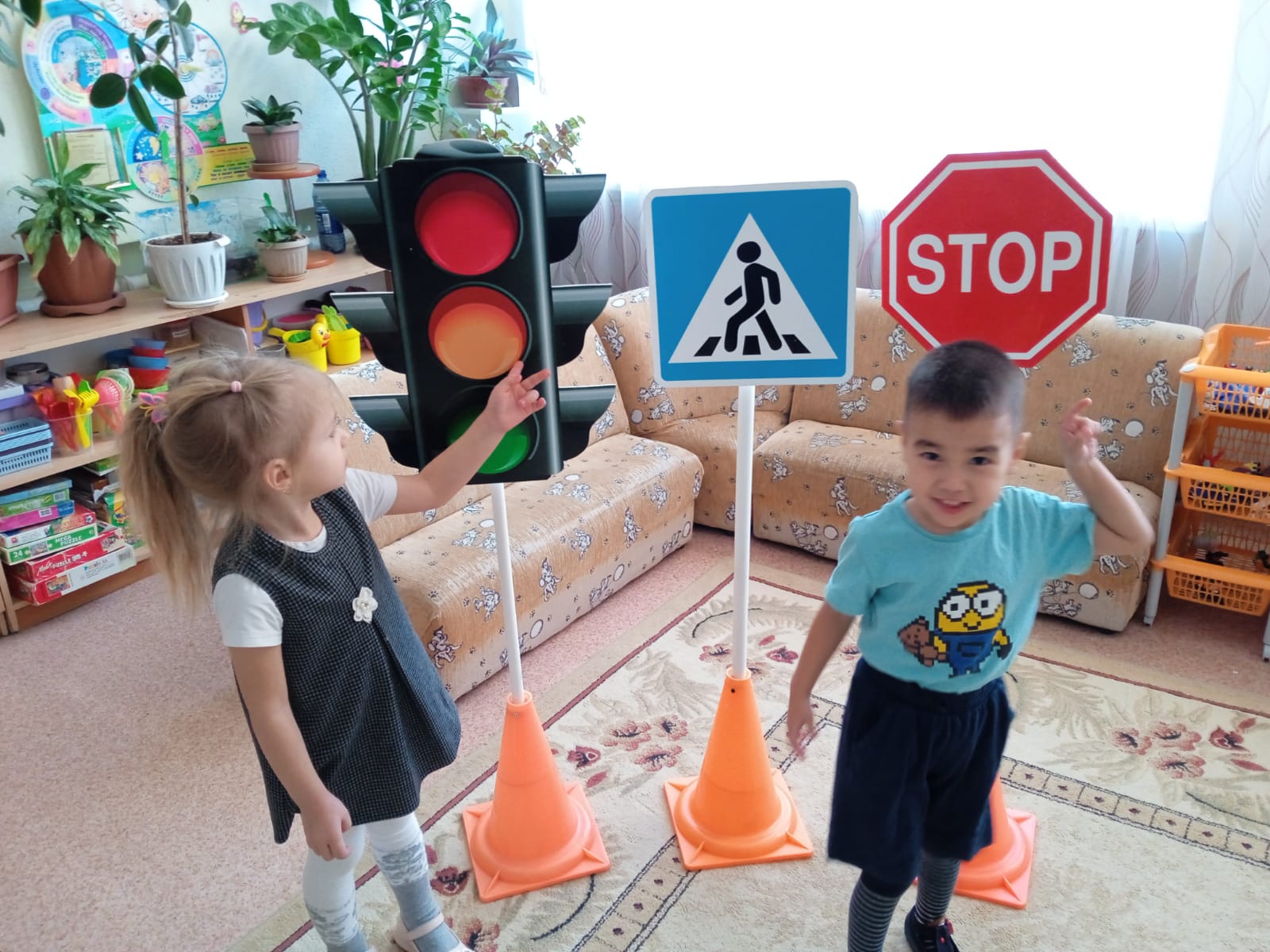 Баланы жолдағы жазатайым оқиғалардан қорғау үшін оған қауіпсіз мінез-құлықты үйрету керек, жол ережелерін үйрету керек. Біздің “Күншуақ” тобында балалар балабақша маңында мінез-құлық ережелерін бекітті. Қызықты әңгіме барысында балалар көшенің қауіпсіз өту белгілерімен жаяу жүргіншілер жолымен, бағдаршаммен және “Stop”тыйым салу белгісімен танысты