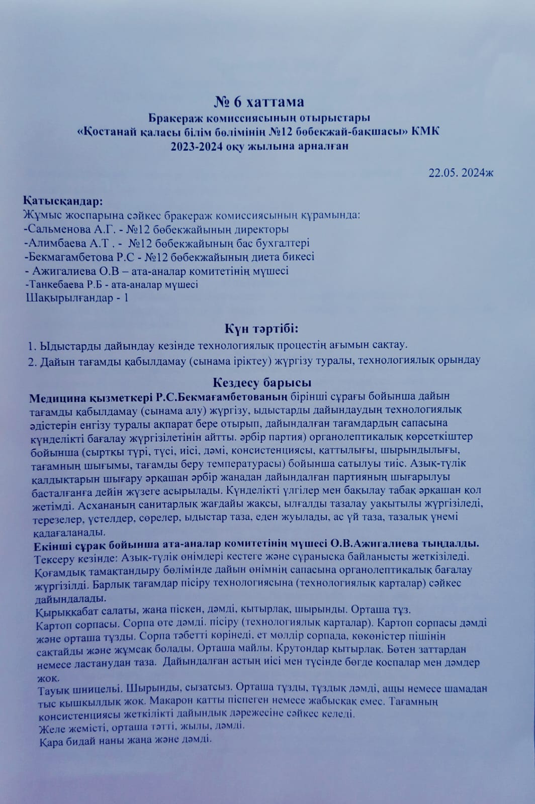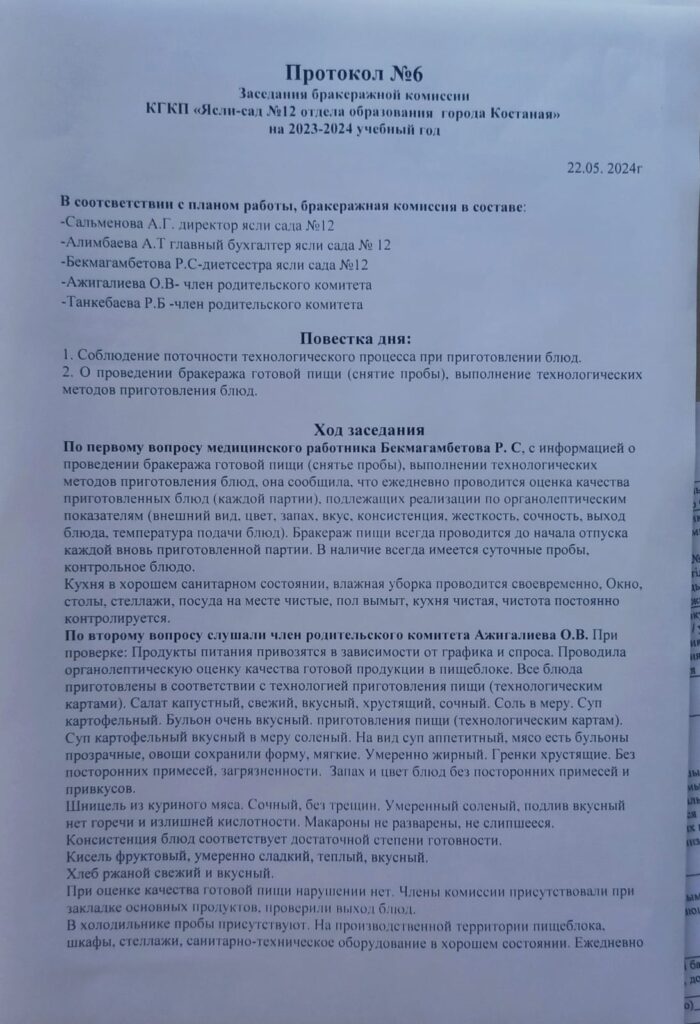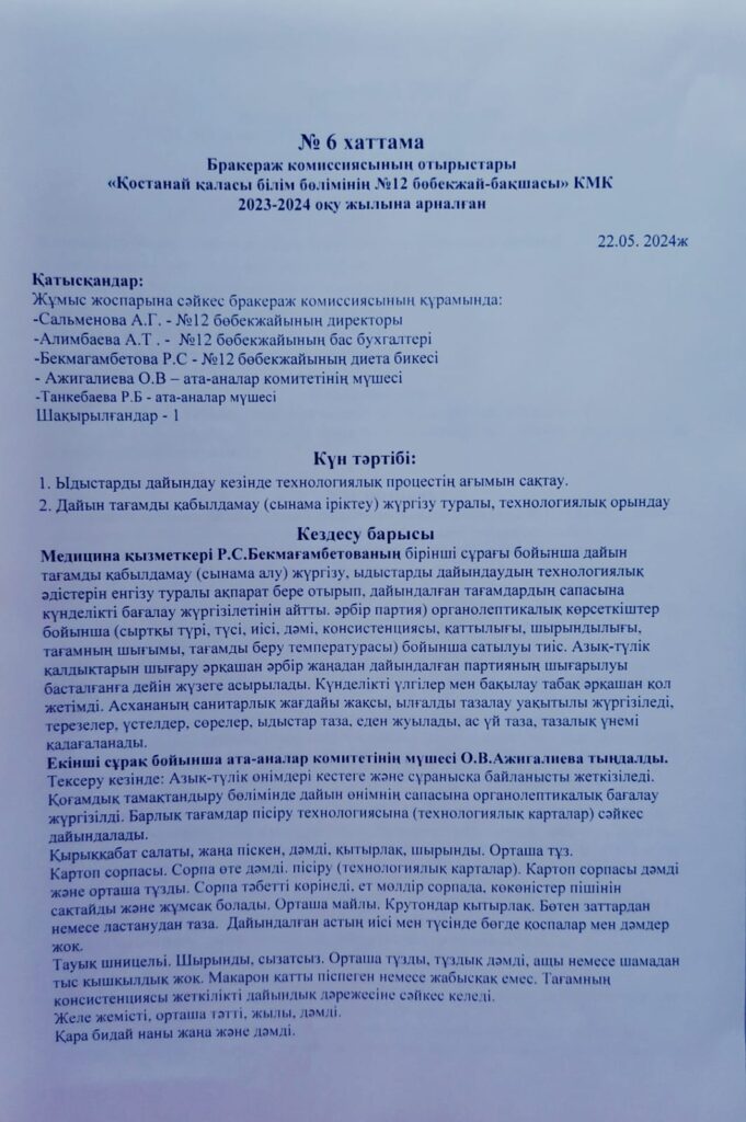 Қостанай облысы әкімдігінің білім басқармасының «Қостанай қаласының 12-Білім бөлімінің бөбекжай-бақшасы» коммуналдық мемлекеттік қазыналық кәсіпорнының тәрбиеленушілерді сапалы тамақтандыруды ұйымдастыру және қамтамасыз етуді бақылау мақсатында 2024 жылғы 22 мамырда қоғамдық тамақтандыру бөлімшесін тексеру жүргізілді