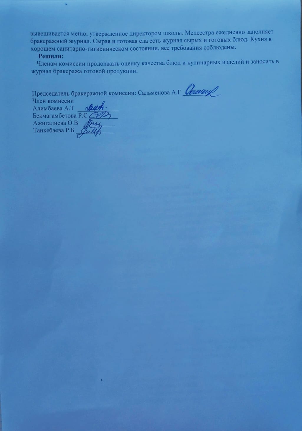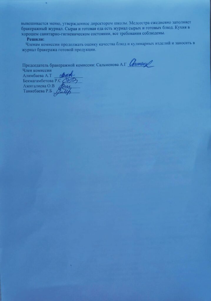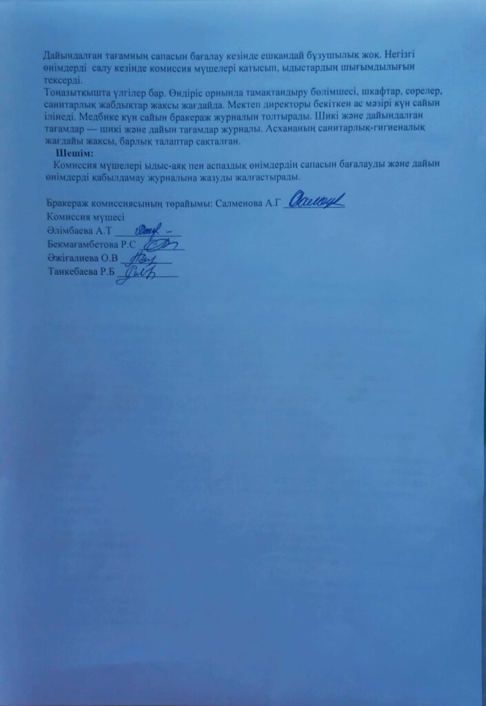 Бракераж комиссия тарапынан тағамның дайындалуына, сапасына және оны таратуға қатысты сұрақтар болған жоқ.