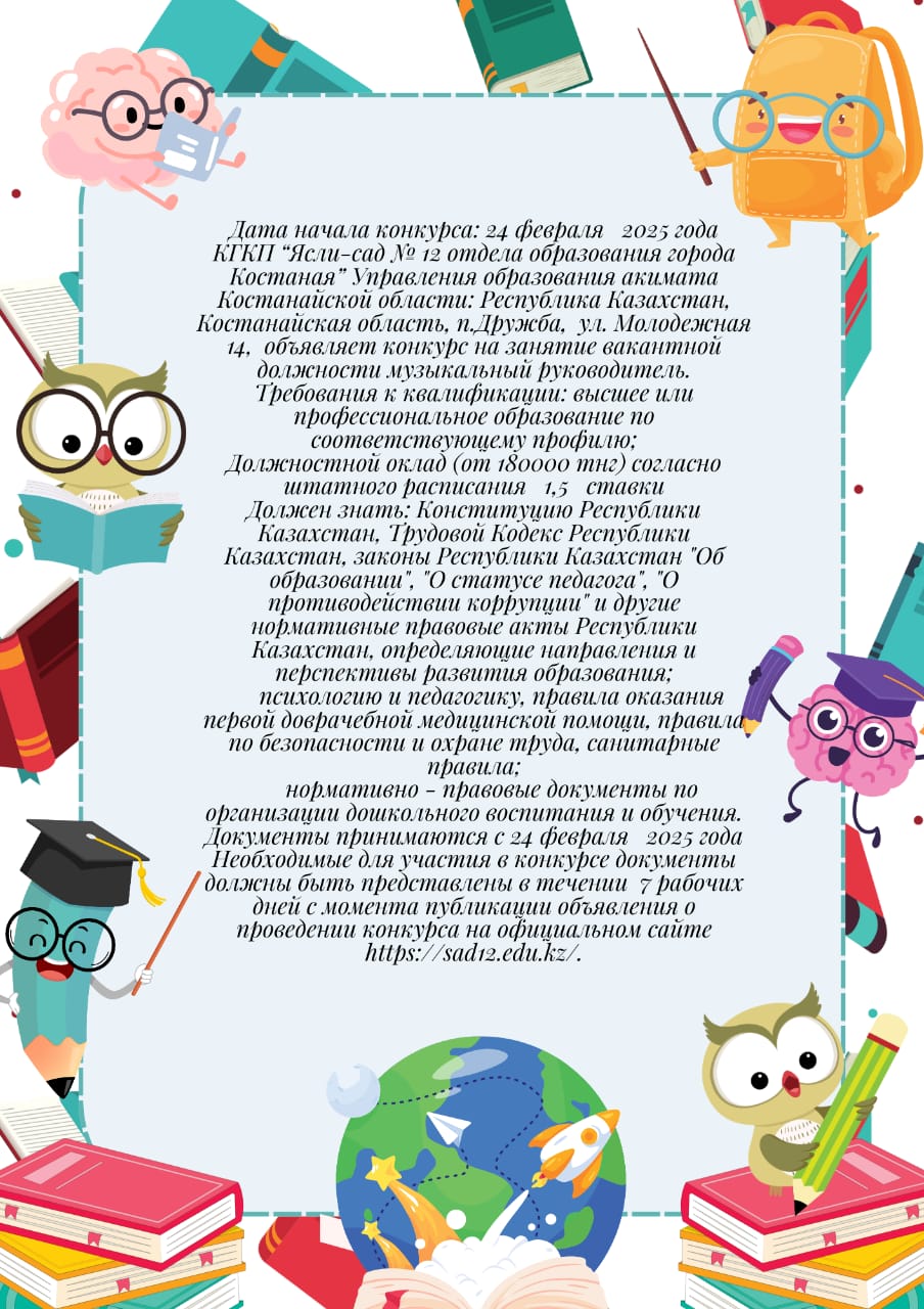Объявление о проведении конкурса вакантной должности музыкального руководителя дошкольной организации 24 февраля, 202524 февраля, 2025 Добавить комментарий Отменить ответ Ваш адрес email не будет опубликован. Обязательные поля помечены * Имя * Email * Сайт Комментарий * Сохранить моё имя, email и адрес сайта в этом браузере для последующих моих комментариев.