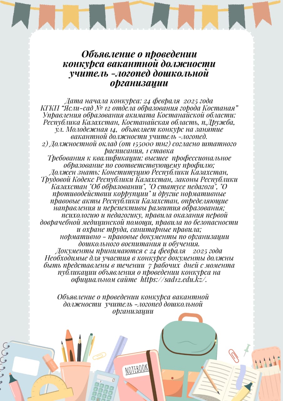 Объявление о проведении конкурса вакантной должности учитель-логопед дошкольной организации 24 февраля, 202524 февраля, 2025 Добавить комментарий Отменить ответ Ваш адрес email не будет опубликован. Обязательные поля помечены * Имя * Email * Сайт Комментарий * Сохранить моё имя, email и адрес сайта в этом браузере для последующих моих комментариев.